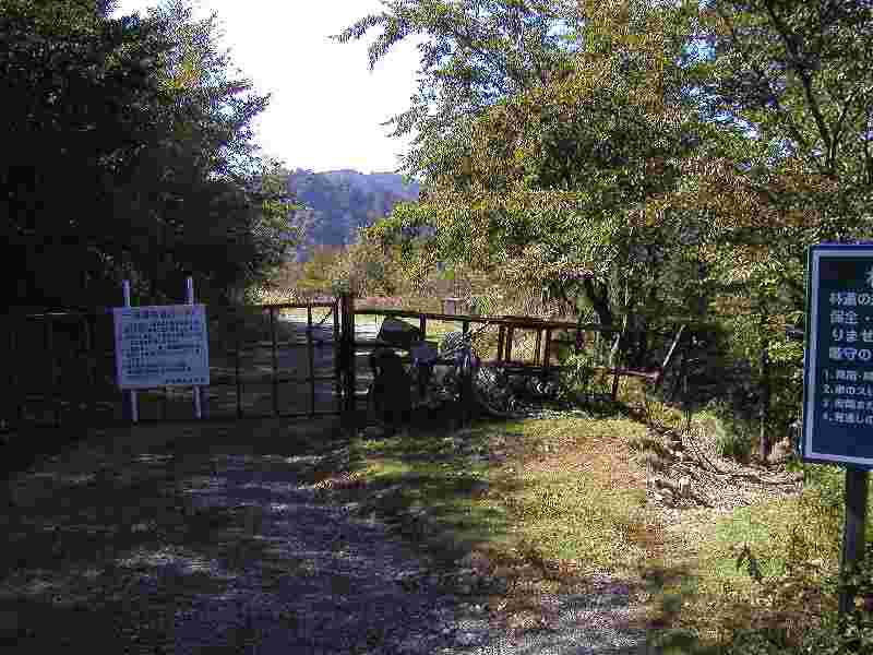山犬段の林道ゲートです、モーターサイクルまでは進入可能(2002年10月) 今回南赤石幹線林道をMTBで走破して、稜線部より黒法師をピストン登山する計画。