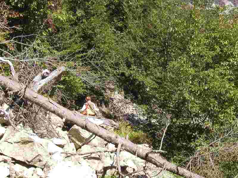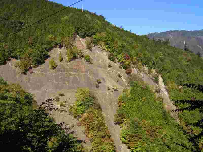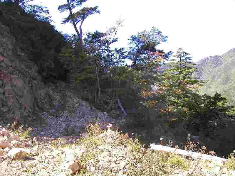 ゲートより約10km地点で地すべりにより完全に崩壊しています、(2002年10月)尚、状況としては徒歩で巻いても通過にかなり時間がかかりそうな状態です。 登山者に聞いたところ昨年は黒法師までモーターサイクルで入山出来たそうです、すると崩壊は2002年の夏台風によるものでしょう、状況からみて当分この状態が続きそうです。黒法師まで入るつもりだったが、さすがに断念、ここより引き返しました。(推定で+15km程で黒法師稜線でしょう、残念です)
