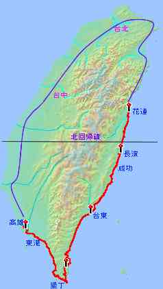 今回、いきあたりばったりで、隣の国、台湾をサイクリングすることにした。 台湾では,おおむね国道には、二輪用走路が設けられており、走りやすくなっています。 実は飛行機で高雄に到着したのは夜中の9時半、当然、飛行場から高雄市街にいって泊ろうと機内では考えていたのですが・・ なぜか脚は南の方向に、そのまま飛行場からナイトラン夜明けには墾丁国家公園近くまできてしまった、これだけでも我ながら”馬”さんな行動なのに、さらに”鹿”さんな行動を取るとはこの時は考えていなかった。