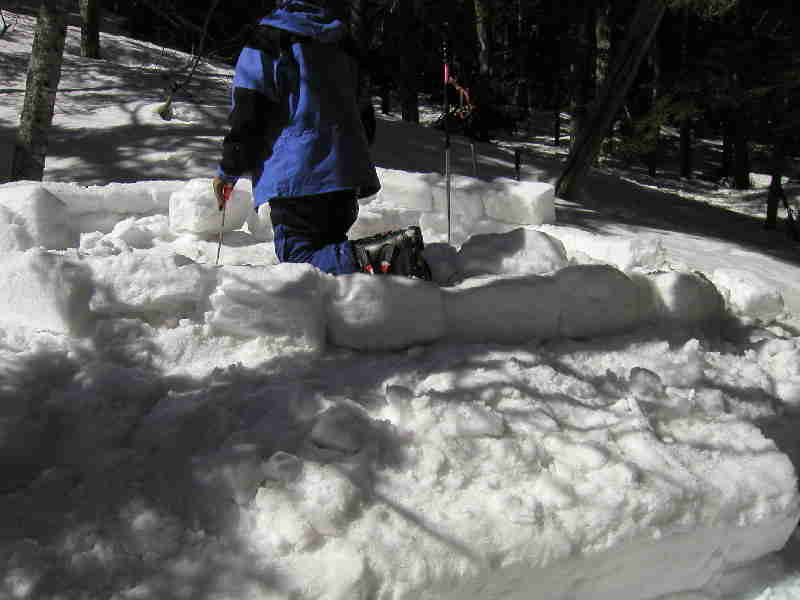 スキー場近くでイグルー作りを始めるも、圧雪状態今一つで大きなブロックを取れなかった。
