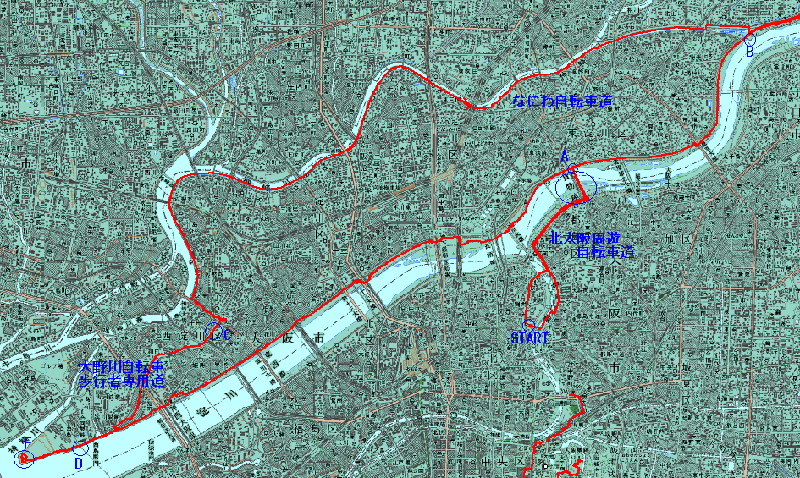 060521 なにわ自転車道を走ろう 走行24km行程 天神橋筋から 大阪北周遊自転車道を使い 赤川鉄橋で なにわ自転車道へ 大野川自転車歩行者へシフトして 矢倉緑地へ そして淀川沿いを戻りマンションへもどり銭湯へ