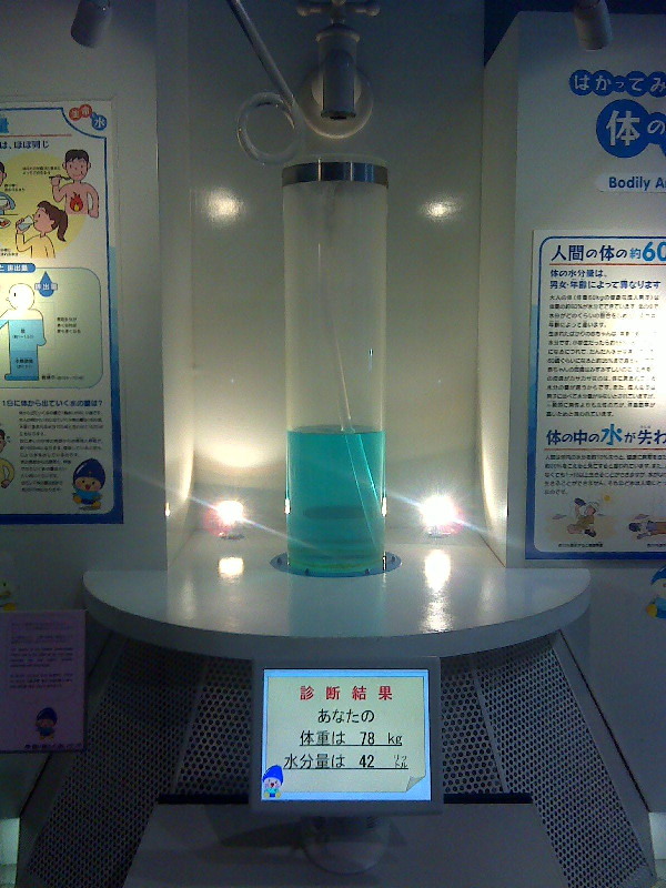 ![]() 「水の科学館」ここは子供向きの科学館です。 ゲーム感覚で、水の勉強ができます。 まず一番目にある体重計、写真の青い水が、自分の体重(正確には水分量)です。 青い水の量は、他の人と一発で比較できるので・・・大人の女性は乗らない方がいいかも。 |