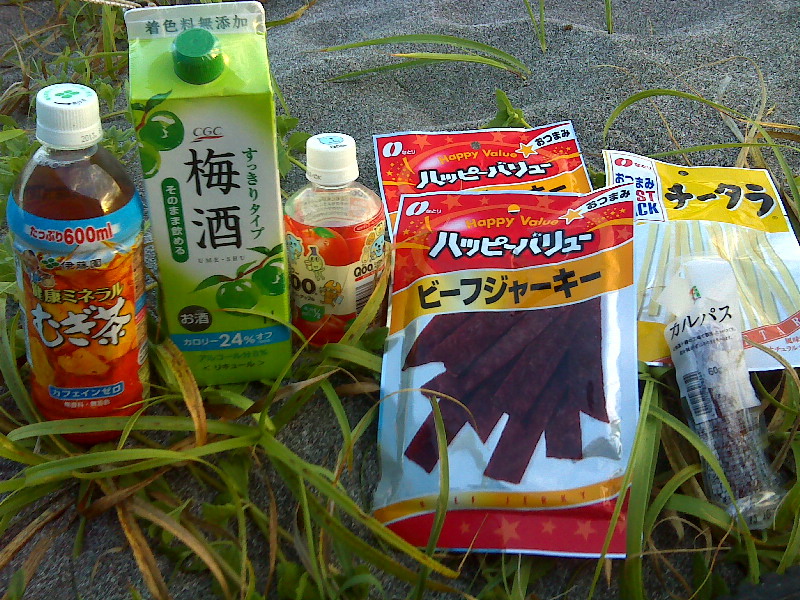 ![]() 人家や施設の少ない白浜の某所で幕営です、夕食はビーフジャーキー・チータラと梅酒&麦茶だ。 |