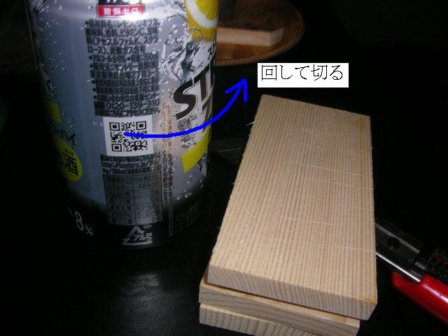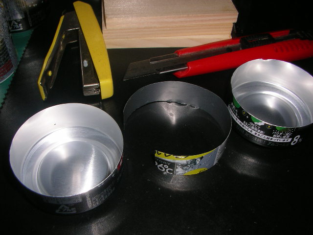 ![]() 蒲鉾板をカッター切削のベースに、缶チューハイの缶を輪切り。 |