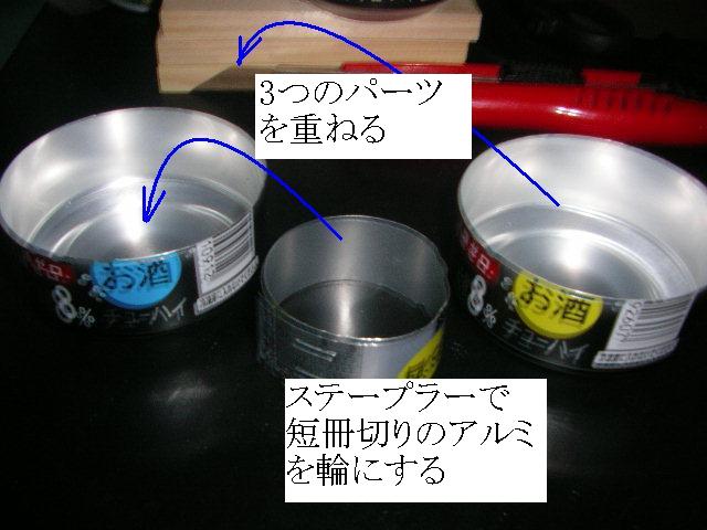 ![]() 後は下蓋+輪切り+上蓋を重ね合わせます。 最後に上蓋部にドリルで孔を開け完成です。 |