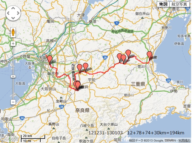 121231 大晦日 なにわ健康ランド湯〜トピア泊 130101 正月 橿原神宮に初詣、明日香村周遊、奈良健康ランド泊 130102 青山高原で幕営 130103 半田軍需工場跡探査、津より輪行で帰阪