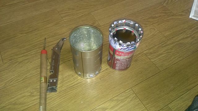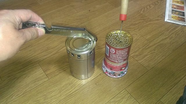 ![]() 微妙に口径の異なるミカンの缶・ミートソース缶・ツナ缶を使用、スプレー缶用の穴開け・錐を使い、空気孔を作る。 |