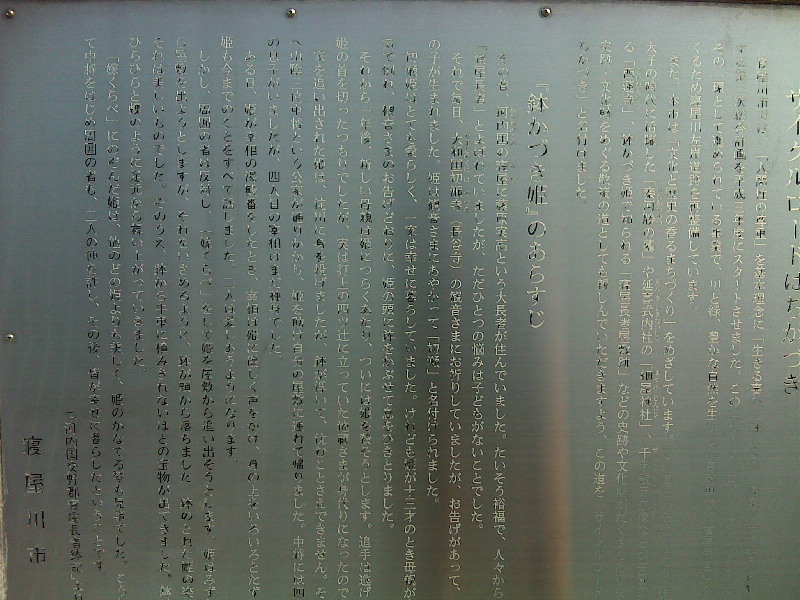 ![]() 寝屋川市に伝わる民話、おとぎ話鉢かづき姫の物語 にちなんだ自転車道。 |