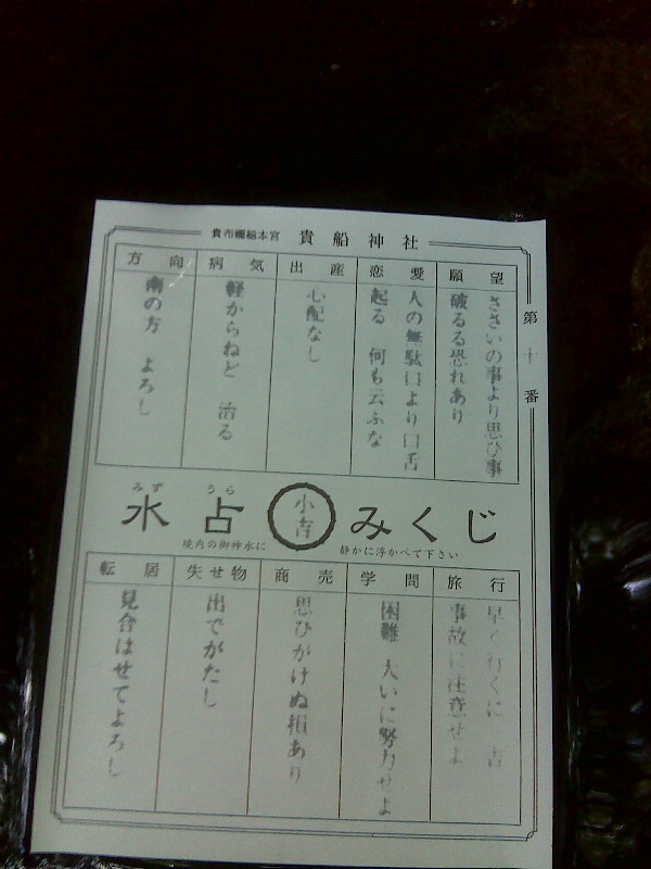 ![]() 本宮には水にぬらすと浮かび上がる「水占いおみくじ」 がありますさて運勢は?小吉でした! |