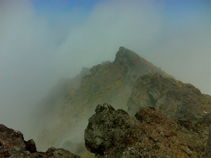 ![]() 山頂付近、予想外に難所で、視界がないことも合わさりルートミスしたり 何回も山頂に登ったり。 |