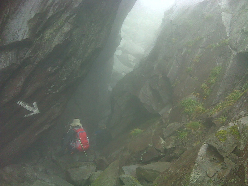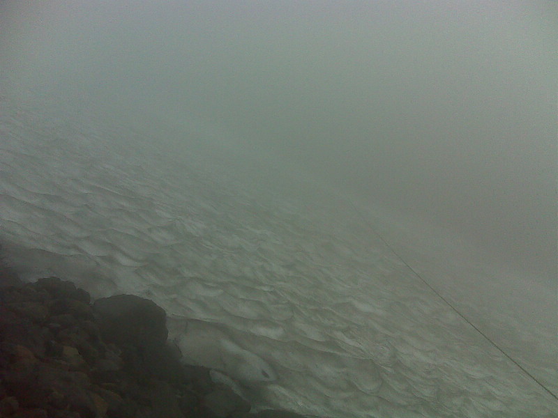 ![]() 14日5時起きで霧の中歩行、雪渓でた=軽アイゼンの対策済である。 迷いそうだぁ〜 |