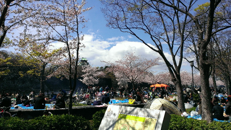 花見客で大混雑、難民キャンプのごとき様相を示す大阪城公園。