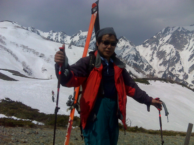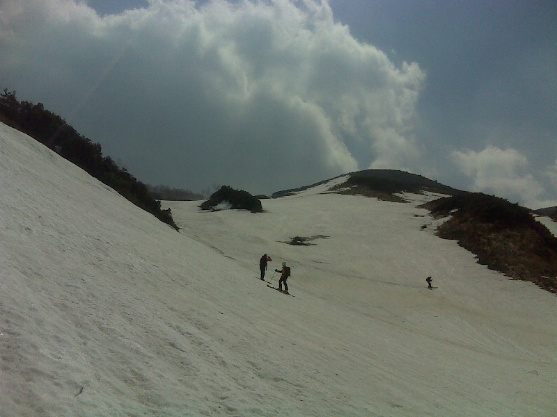 八方尾根沿いには雪なし、スキーを担いで八方池まで。