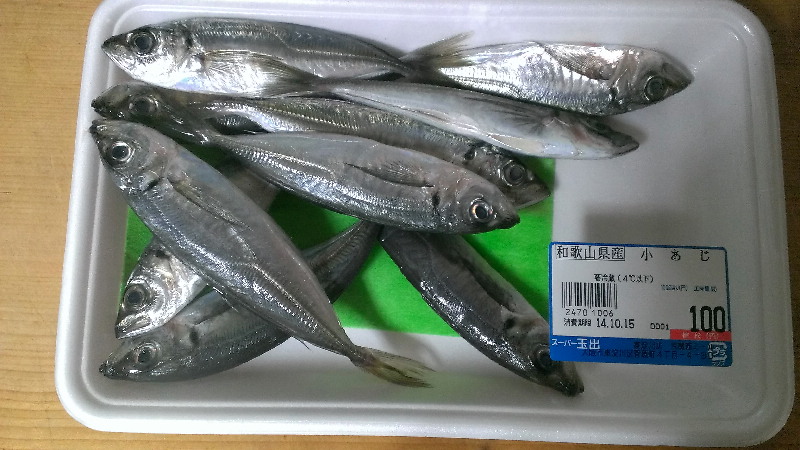 13日、台風接近中の休日。どうしてもアジがたべたくなりスーパー玉出で購入、10匹100円・・1匹あたり10円也。