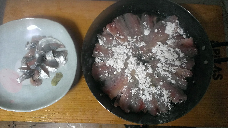 セイゴを取り、三枚おろし、一部は刺身で食しながら、グリルパンに並べ、小麦粉を振り、サラダオイルを振りかけグリルで焼く。