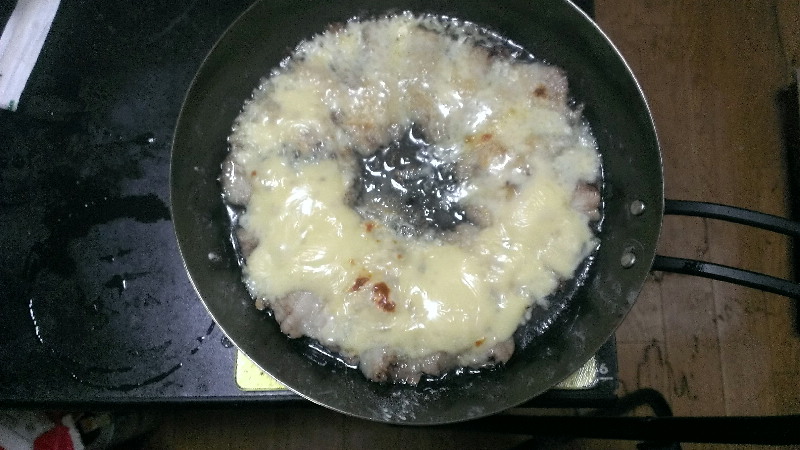 焼けたら、チーズをのせさらに焼く、西洋風のアジの焼き物出来上がり。