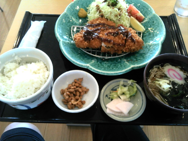 茨城空港で昼食、とんかつ定食になんと・・納豆付き ・・・ 米・豚・蕎麦・納豆とすべて茨城県特産物だな (^_-)-☆