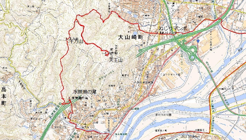 ![]() 十方山から下ると最後は名神のトンネル上に出る さらに下り名神と交差する場所(高速道路下)に水無瀬の滝。20mほどの落差の滝ですが結構水量が多い |