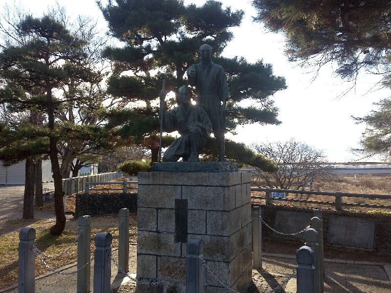 玉川上水工事の指揮をとった玉川兄弟の像と羽村堰堤。