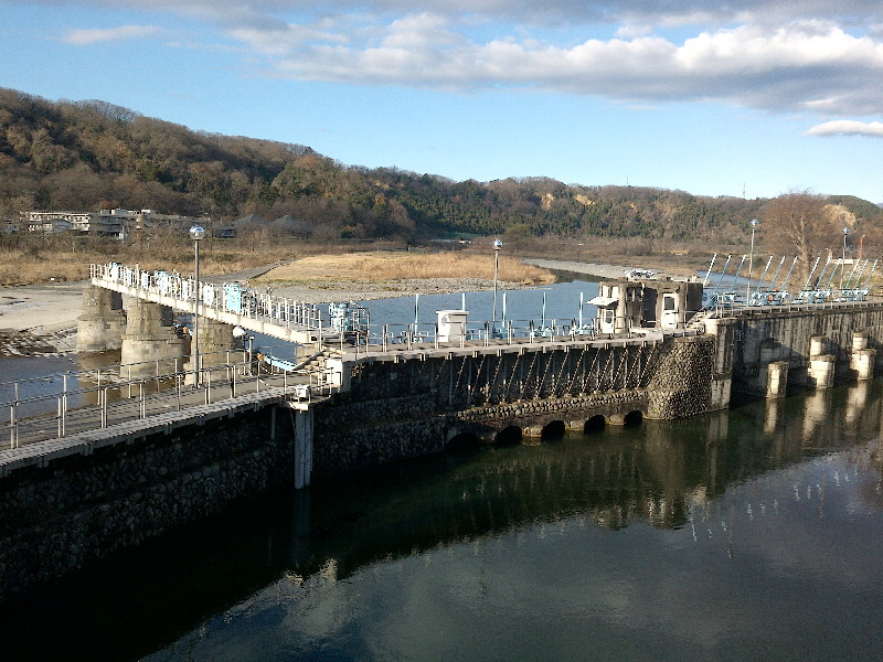 奥多摩がまじかに視え、関東平野の端の感じが出てくると 多摩川自転車道の終点とされる羽村堰堤(はむらしゅすいせき)に到着。