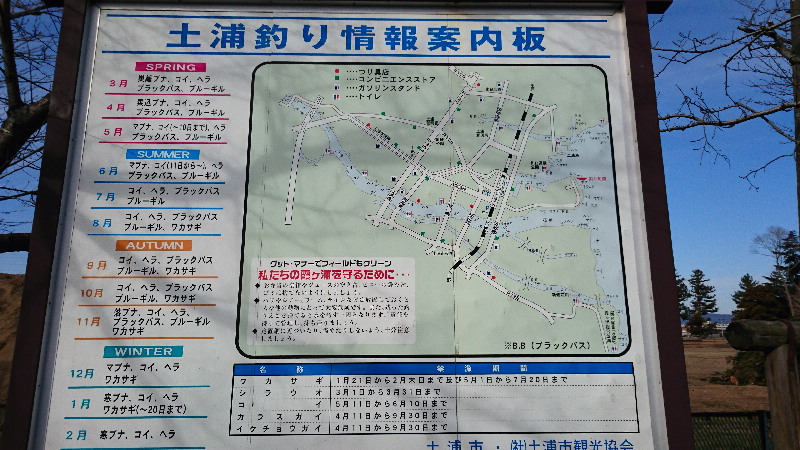 ![]() 土浦港にある釣り情報案内板、他の土地ではこの様な看板はあまり見かけませんが、禁漁期間の周知のためかもしれません。 |