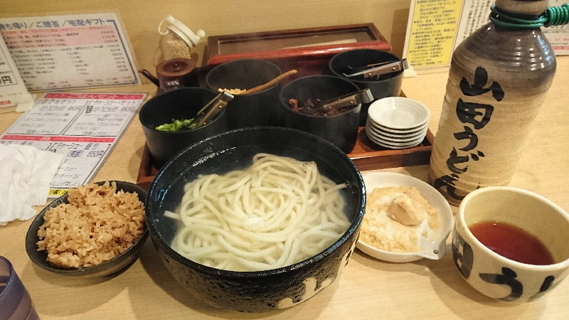 ![]() 山田製麺所 美味しい釜揚げうどん、生生姜を下ろし、徳利に入った汁を入れてすする。 |