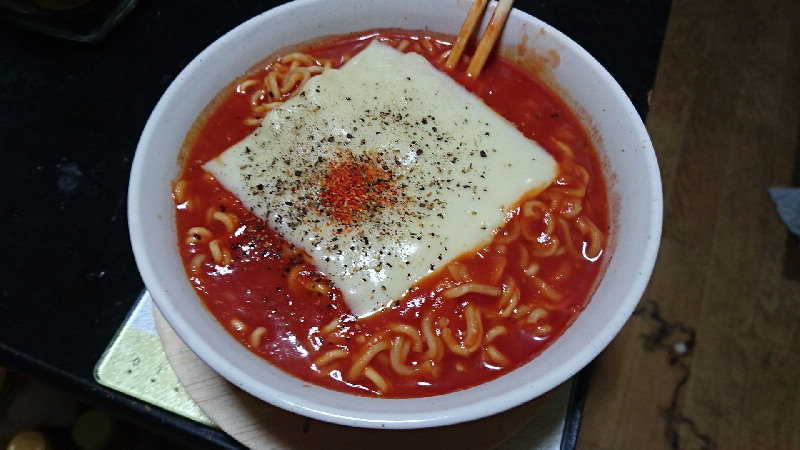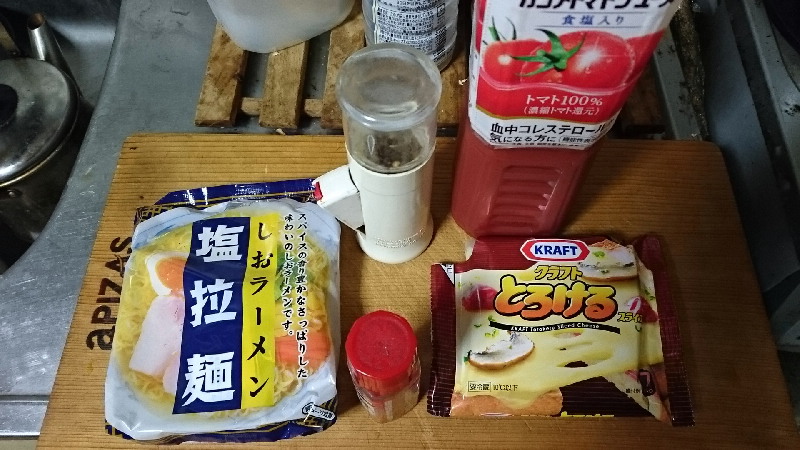 トマトジュースで塩ラーメンを煮込む、スープは半分使用、仕上げにチーズと胡椒を入れる。