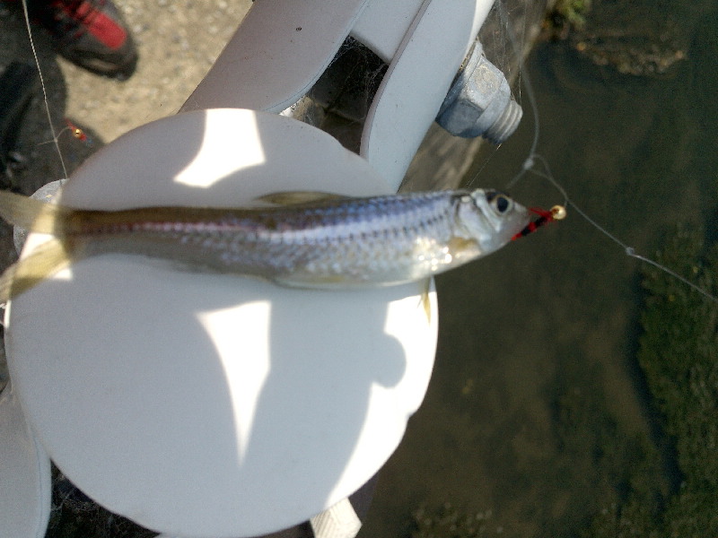 途中の川、魚影があったので毛バリで釣れないかと試した・・釣れました、ウグイかな。