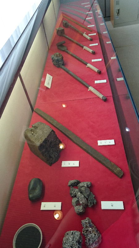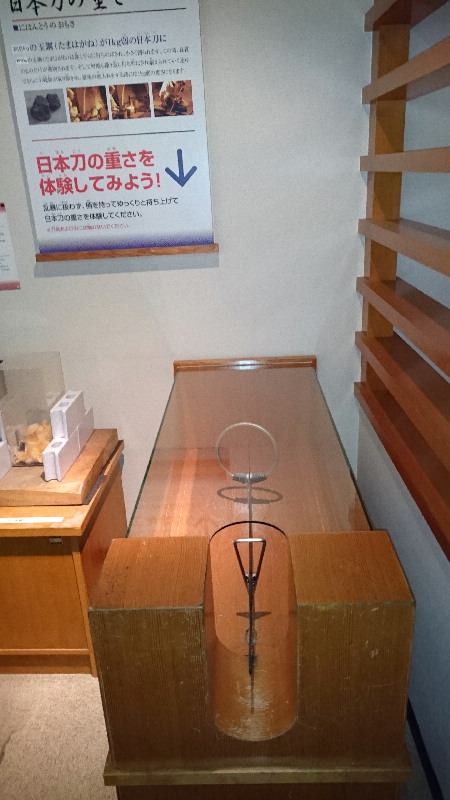 展示物は撮影禁止な中、撮影可能な展示品、日本刀の重さ体験、感覚としては鉈と鉄製スコップとの中間ぐらいの重さで長さの割には軽い感じです。