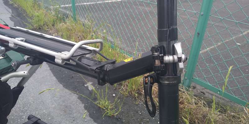 ビームラックのシートポスト側が横方向に稼働する様に、スペーサーを入れて締め付けない様に連結(ペットボトル由来の滑り緩衝材付き)。
