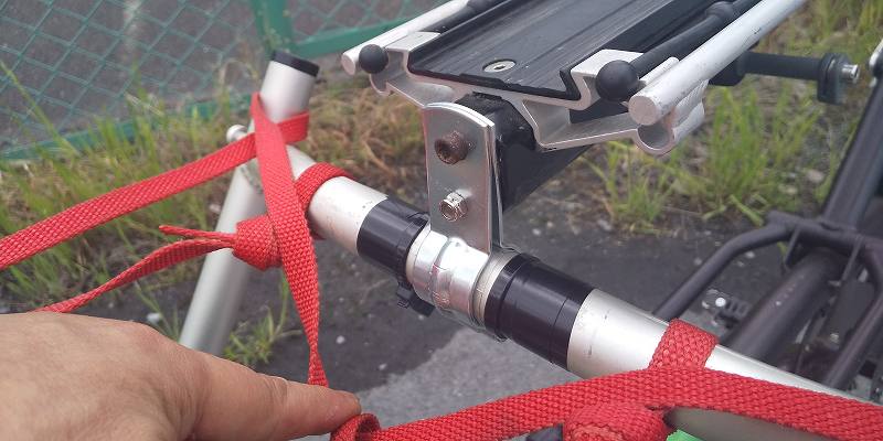 使い古しのTOPEAK トピーク MTX ビームラック リアキャリアと背負子を金具で連結。