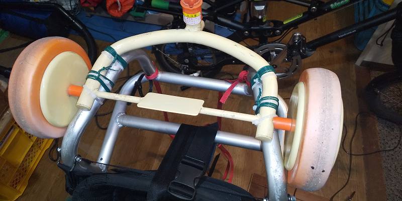 廃棄されていた子供用三輪車の後輪部分カットして、持っていた背負子に取り付け。