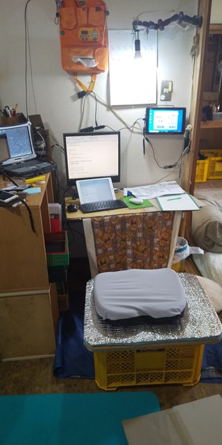 家内ジムの作成についでに、在宅勤務用の机と椅子を作成?(農業用コンテナと合板を重ねただけですが、使い古しのテントマットをカットして敷いたりして、それなりに工夫)。