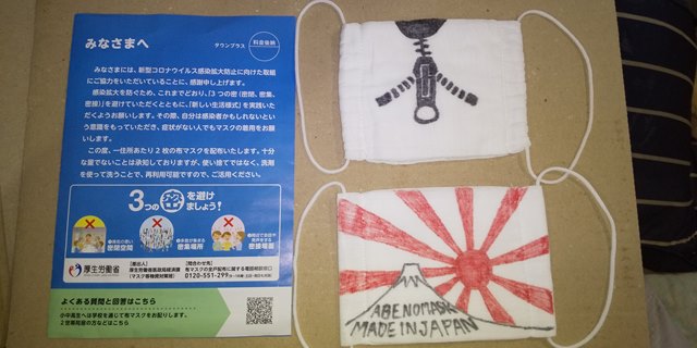 政府より支給の布マスク、普段使い捨てのマスクを利用しているので使わないのですが、見ているうちにいたずら書き