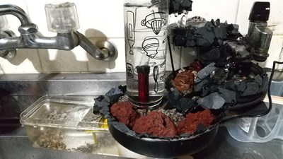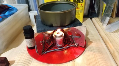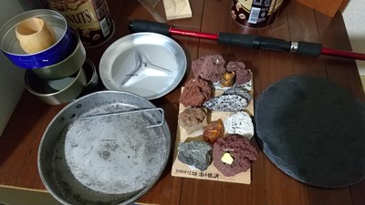 滝のある水槽の試作を廃棄予定のコッヘルの蓋、フライパン、空き缶、パスタ容器、各地の山頂で集めた石を利用して行います。