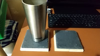 100均の天然スレートコースター 3枚入り、1枚はアロマオイル用として使用し、残り2枚(コースターとして利用しようとしたが、吸水しないので水滴だらけになった)