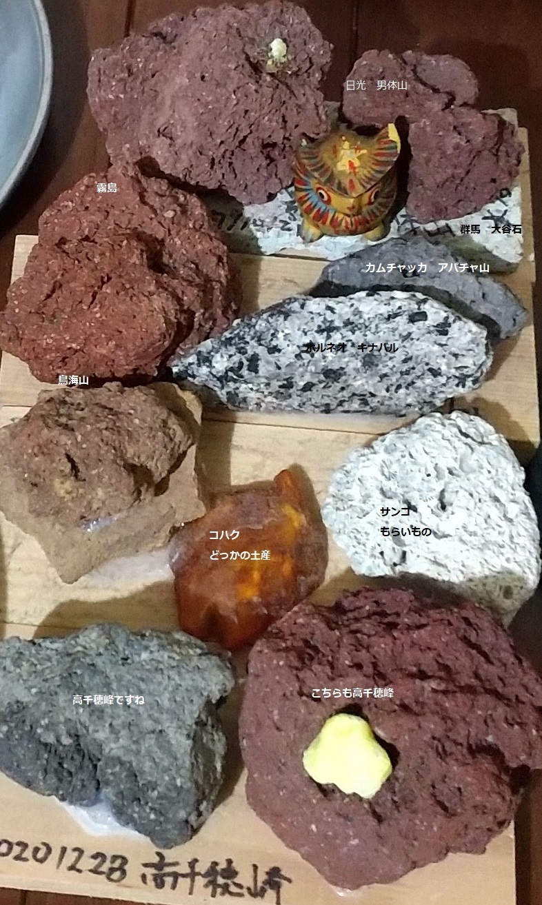 カムチャッカのアパチャ山 ボルネオのキナバル山の石 日光男体山 霧島 鳥海山 高千穂峰などの火成岩・・溶岩が多いかな。