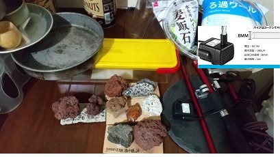 購入パーツはUSB水中ポンプ、チューブ、濾過フィルターそして100均の天然スレートと麦飯石合計1500円程です。