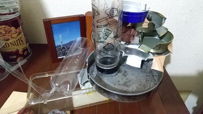 今回、肝心の水槽部分のパスタ容器が容量不足(メダカを入れるのもためらわれる)ので。これ以上の飾りは止めて、つぶして廃棄しました。