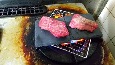 100均の天然スレートコースター ハンマーで砕く前に、黒部和牛の天然石焼きに使用してみる(本来は直火使いは禁止です、何故かと言うと天然スレートなので3回目ぐらいで割れます)