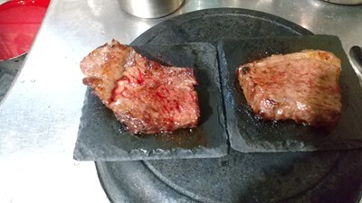 肉がいいのか、石焼きでじんわりと熱が伝わる焼き方がいいのか分かりませんが。血のにじむミディアムレアの完成となります。